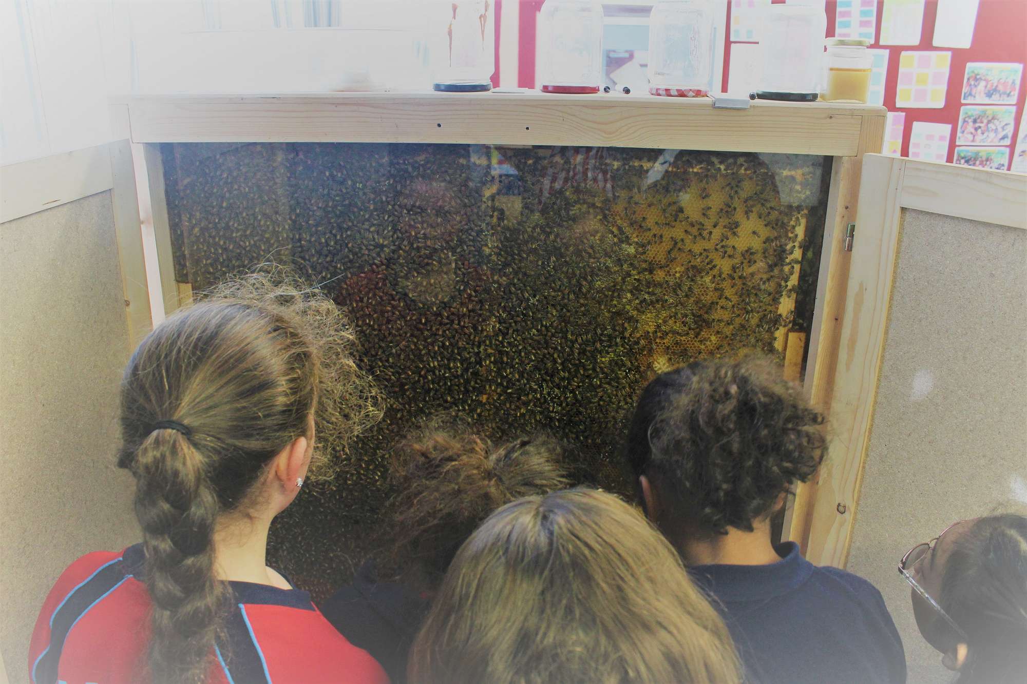 We have an Apiscope in our classroom. An Apiscope is a fully functioning beehive that we can observe. At the end of term 1 when it is at its fullest we estimate have around 20,000 bees in it.